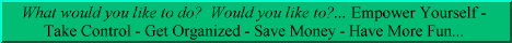 | Self-Empowerment. Personal Organization (including getting organized and time management). Voluntary Simplicity and Ecological Living (Including voluntary simplicity, ecological living, consumer reports, and ecological homes). Working (including job hunting, working, starting a business or co-operative, taxes, investing, and retirement). |